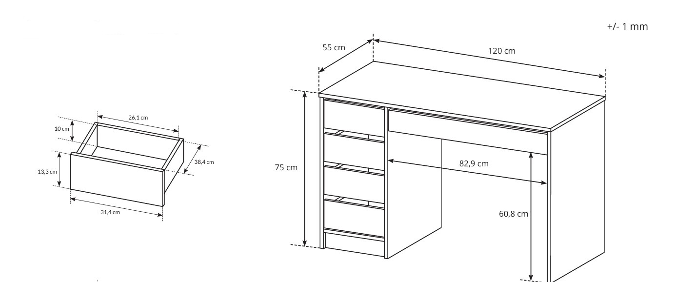 Biurko wykonane w całości z płyty laminowanej 16 mm odpornej na wilgoć i zarysowania w kolorze białym.