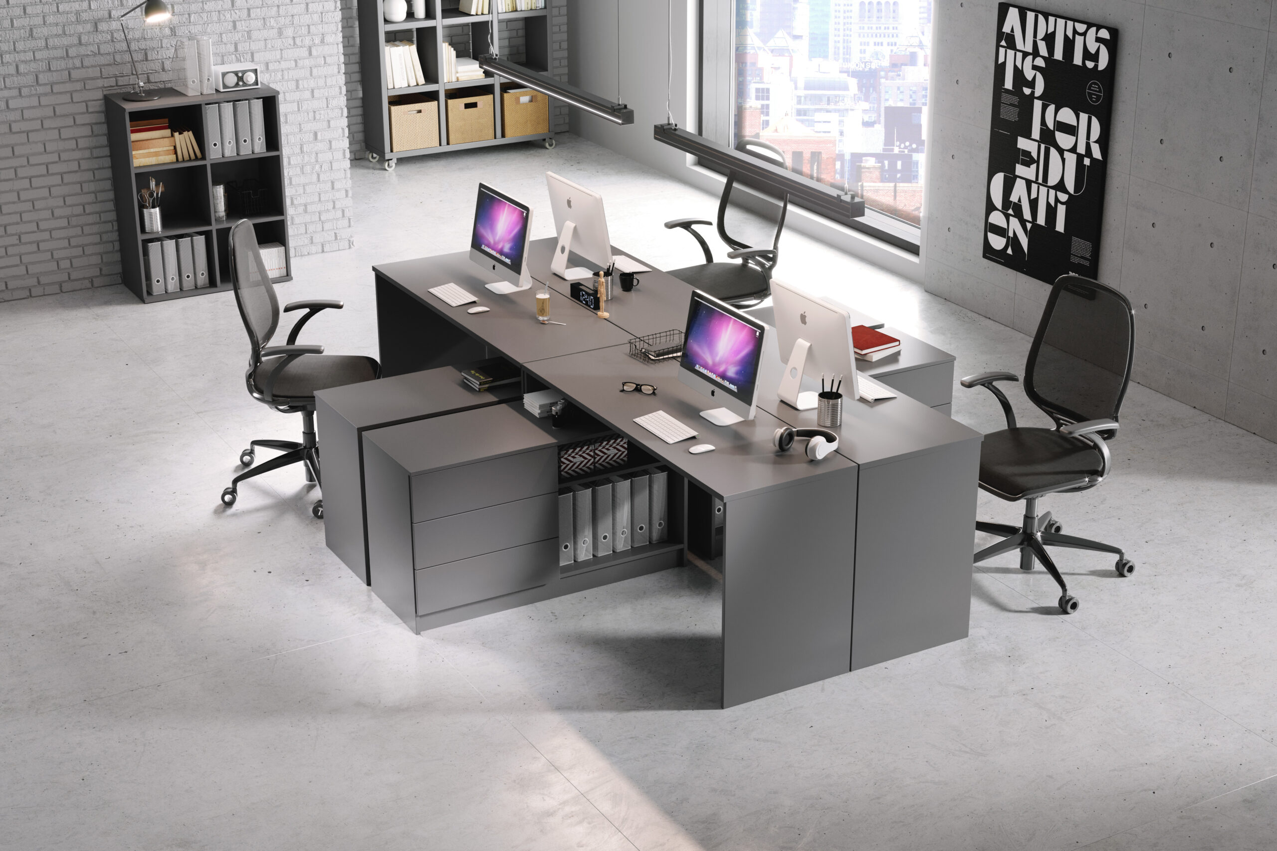 Biurko wykonane w całości z płyty laminowanej 16 mm odpornej na wilgoć i zarysowania w kolorze grafitowym.