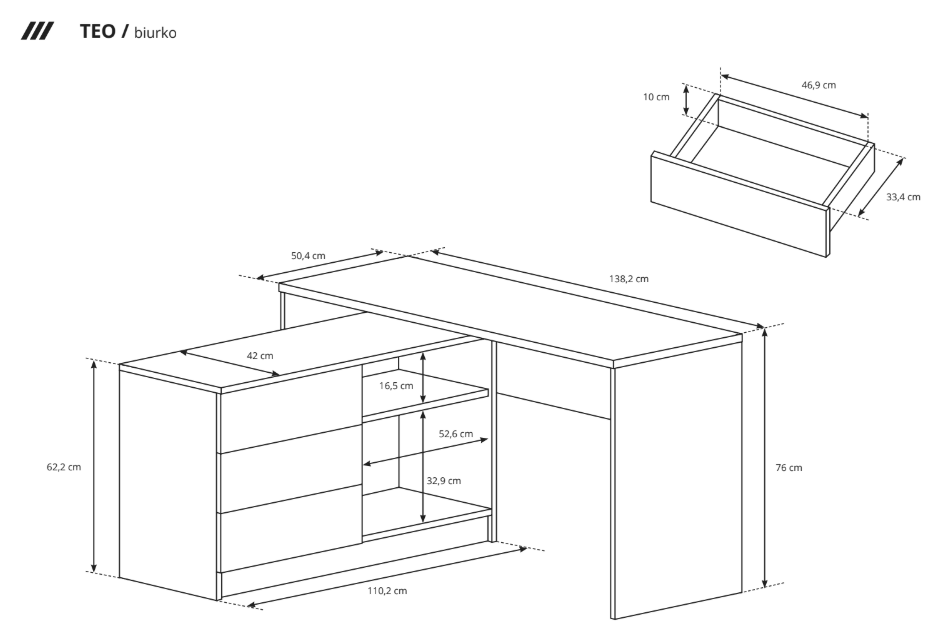 – Biurko – szer. 138,2 / wys. 76 / gł. 50,4 cm