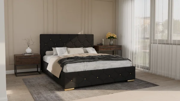 Estetyczne wykończenie tyłu – tył łóżka obity czarnym wigofilem.