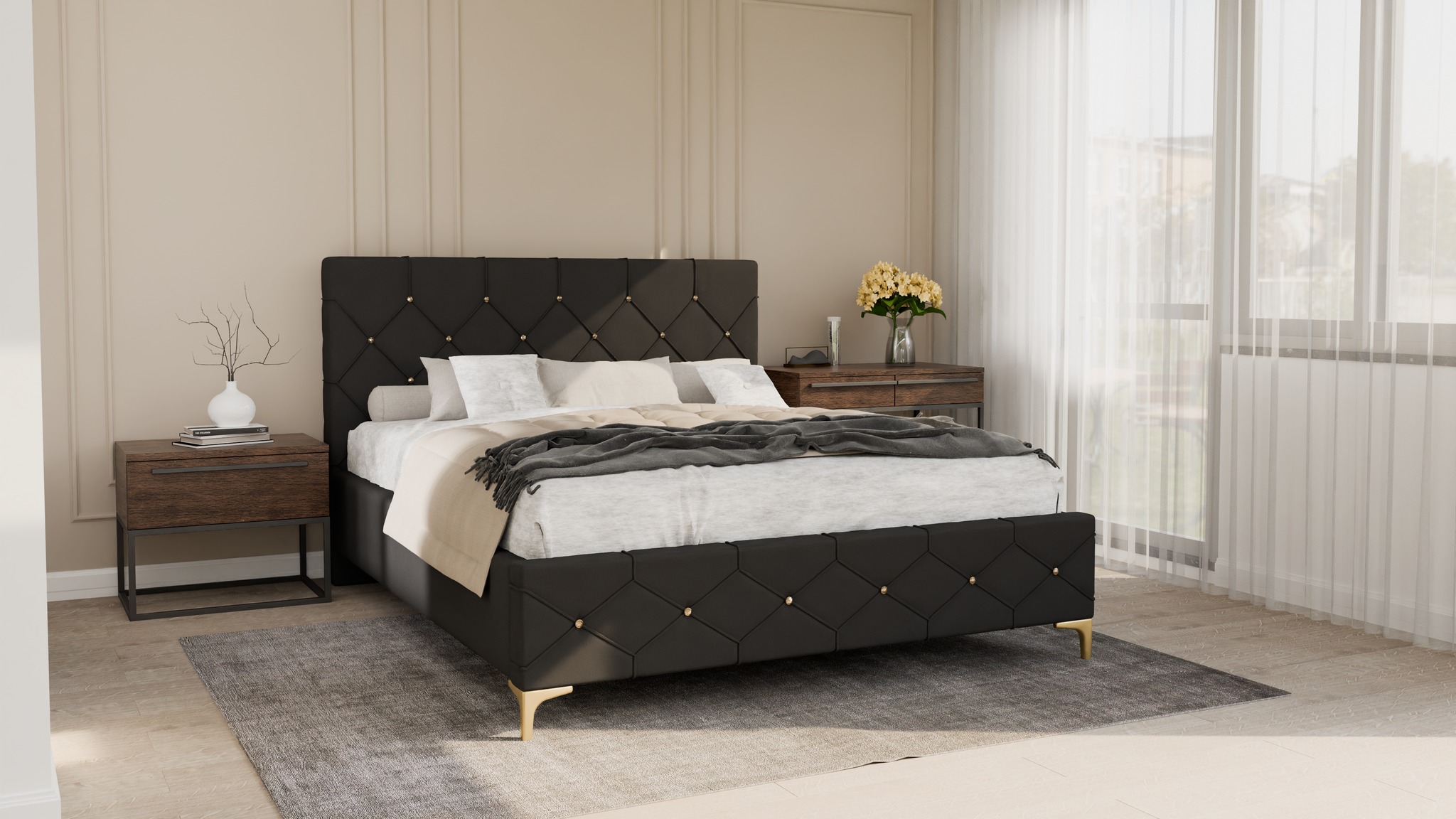 Estetyczne wykończenie tyłu – tył łóżka obity czarnym wigofilem.
