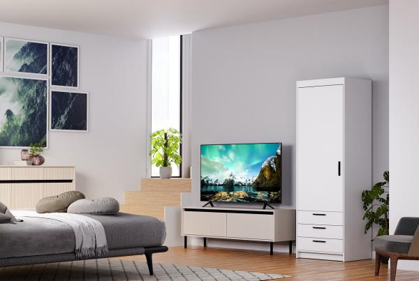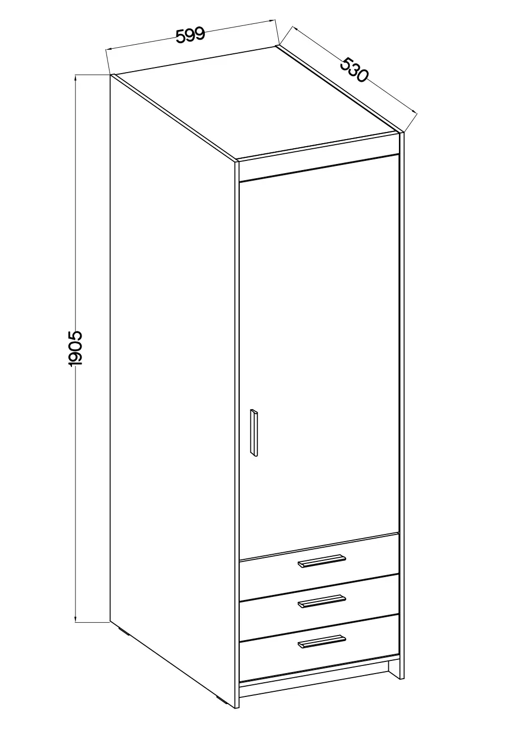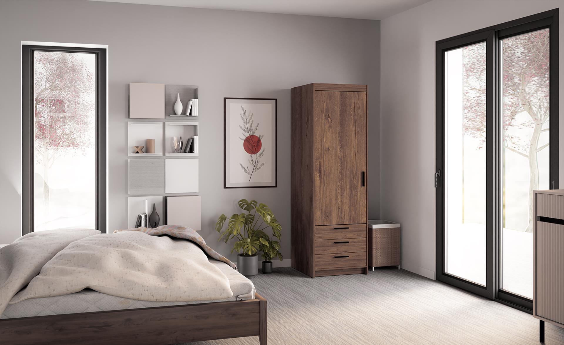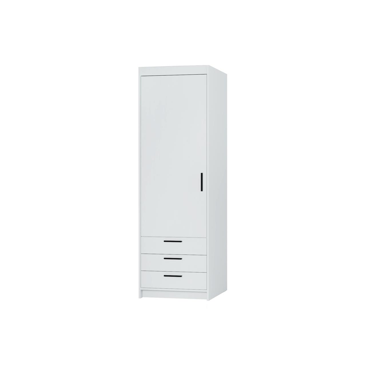 Jednoskrzydłowa szafa z trzema szufladami to praktyczny mebel, który doskonale sprawdzi się w sypialni, pokoju dziecięcym lub garderobie. Fronty i korpus wykonano z płyty laminowanej o grubości 15 mm, a krawędzie wykończono trwałą okleiną z melaminy, co zwiększa odporność mebla na uszkodzenia.