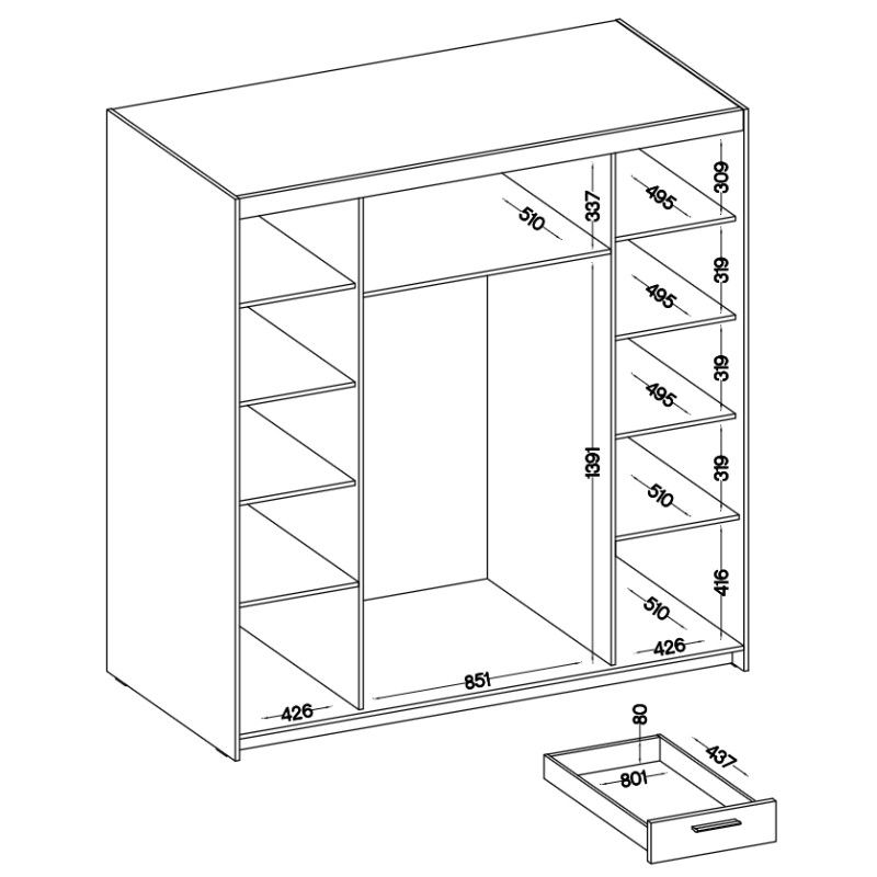 Środkowe drzwi zostały wyposażone w lustra, co dodaje przestrzeni i ułatwia codzienne użytkowanie. Szuflady osadzone są na prowadnicach rolkowych z wysuwem 3/4, co gwarantuje wygodny dostęp do przechowywanych przedmiotów.