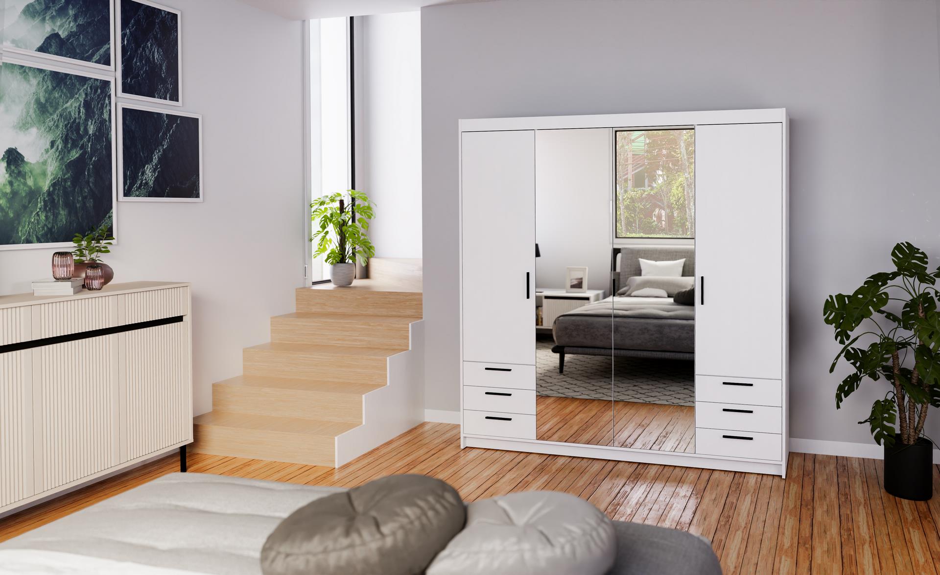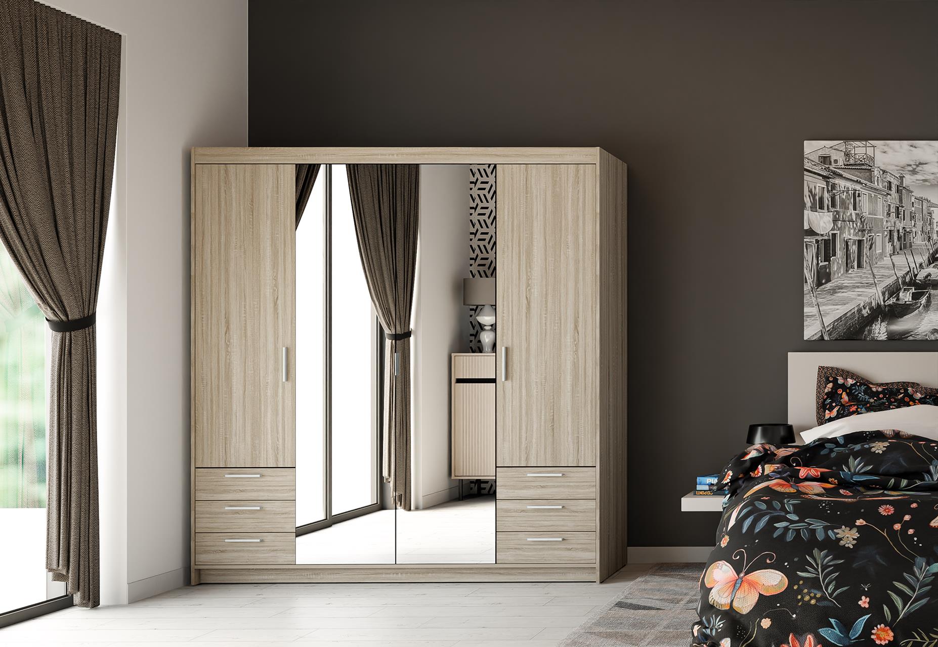 Szafa czterodrzwiowa z sześcioma szufladami to funkcjonalne i eleganckie rozwiązanie do każdej sypialni lub garderoby. Fronty i korpus wykonano z płyty laminowanej o grubości 15 mm, a krawędzie wykończono trwałą okleiną z melaminy, co zapewnia odporność na uszkodzenia i estetyczny wygląd mebla.