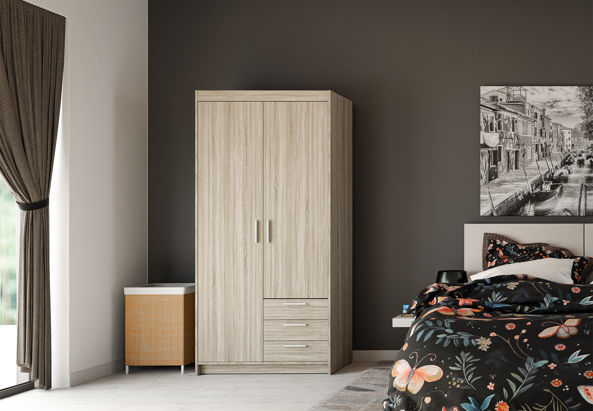 Wyposażona w wygodne uchwyty z tworzywa oraz szuflady na prowadnicach rolkowych z wysuwem 3/4, szafa łączy funkcjonalność z wygodą użytkowania. To praktyczne rozwiązanie, które sprawdzi się zarówno w sypialni, garderobie, jak i przedpokoju, oferując odpowiednią przestrzeń do przechowywania.