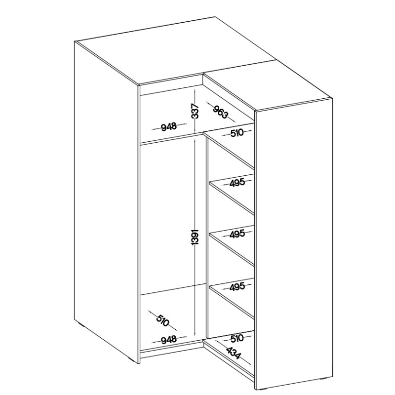 Szafa narożna została wykonana z płyty laminowanej o grubości 15 mm, a krawędzie zabezpieczono trwałą okleiną z melaminy, co podnosi odporność mebla na uszkodzenia i zapewnia estetyczny wygląd. Fronty wyposażono w praktyczne uchwyty z tworzywa, ułatwiające komfortowe otwieranie szafy.
