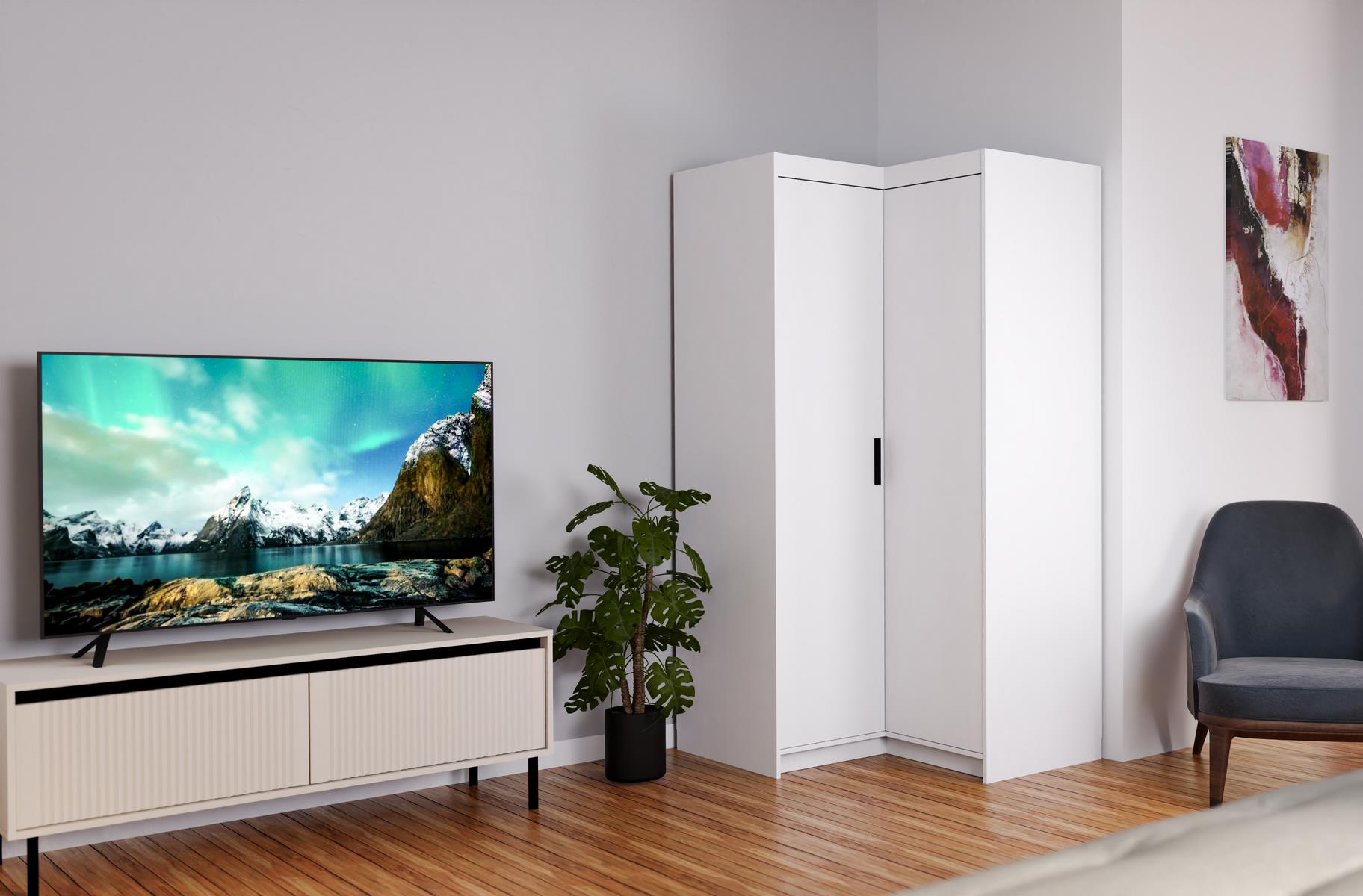 Korpus szafy charakteryzuje się solidną konstrukcją, a tylna ściana wykonana z płyty HDF dopełnia całość pod względem funkcjonalnym i wizualnym. Szafa narożna to praktyczne rozwiązanie, które pozwala maksymalnie wykorzystać przestrzeń w pomieszczeniu, oferując dużą powierzchnię do przechowywania.