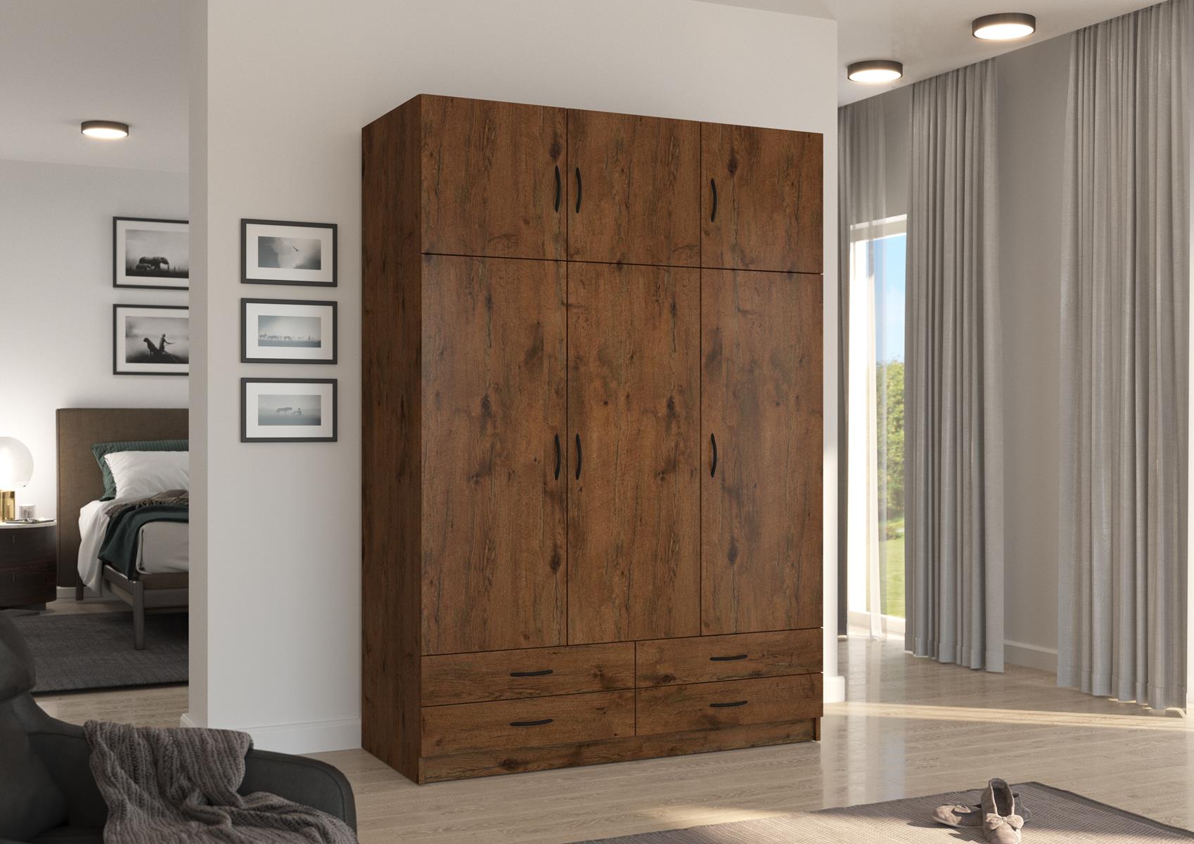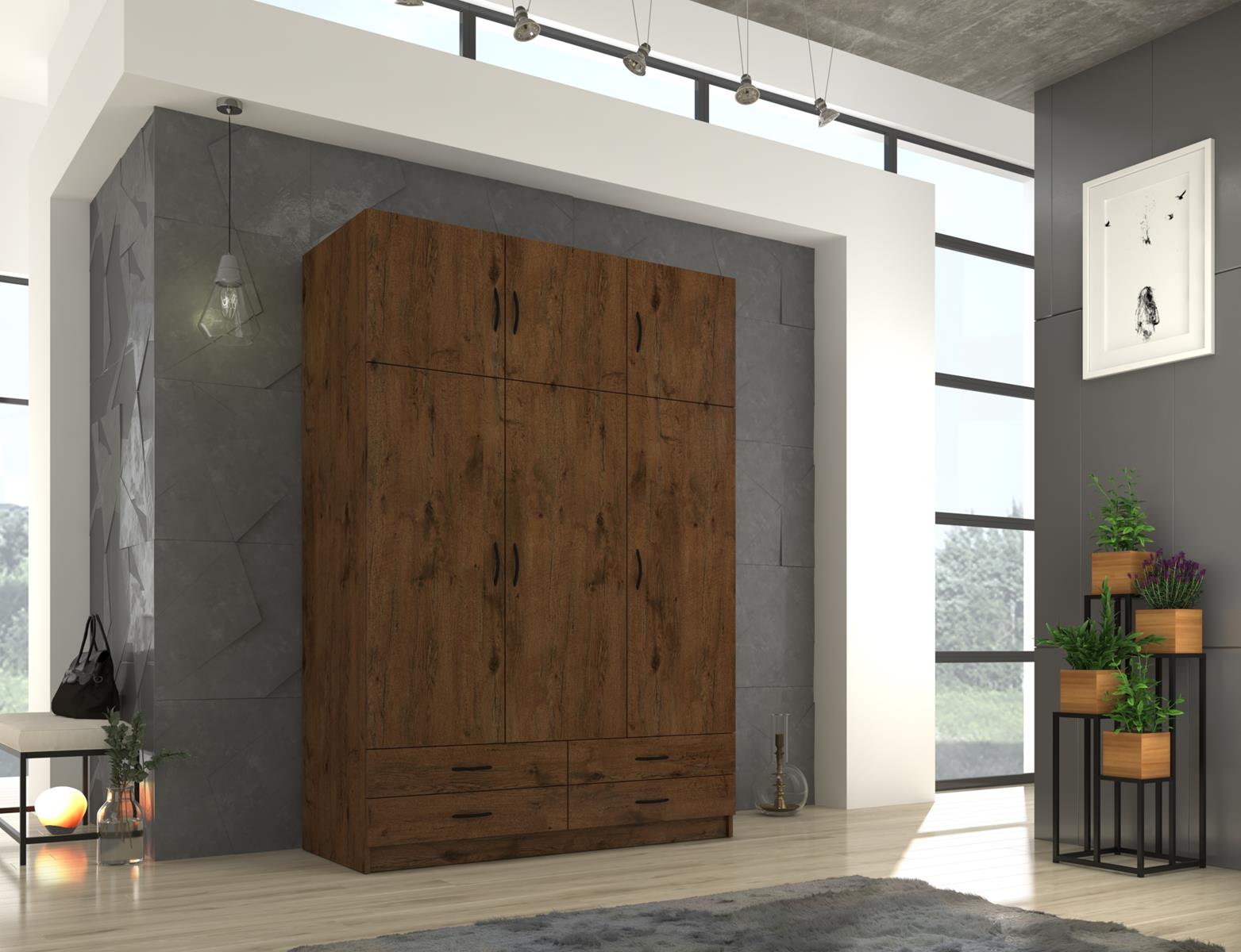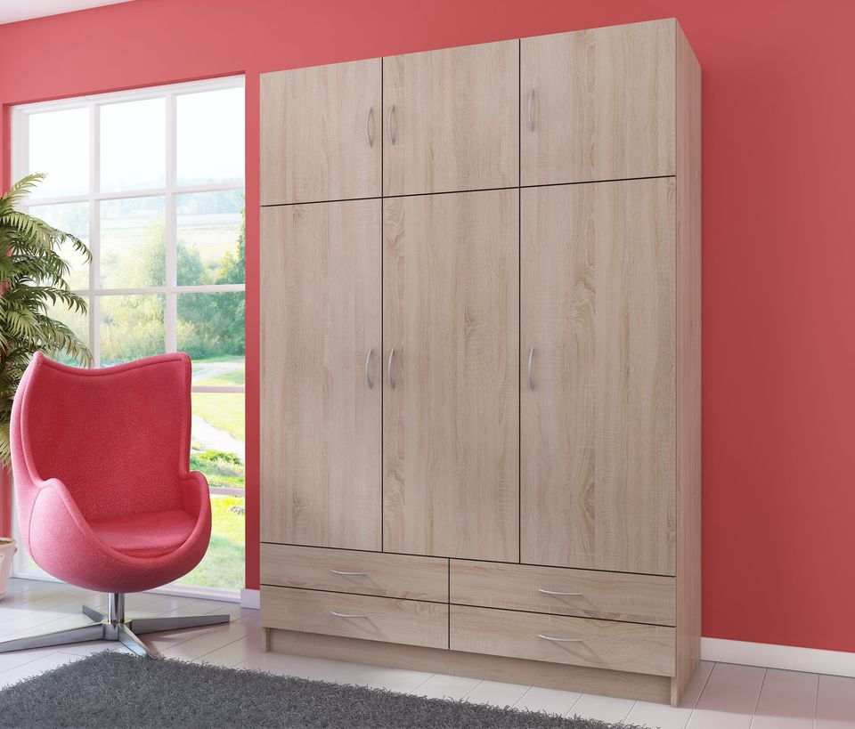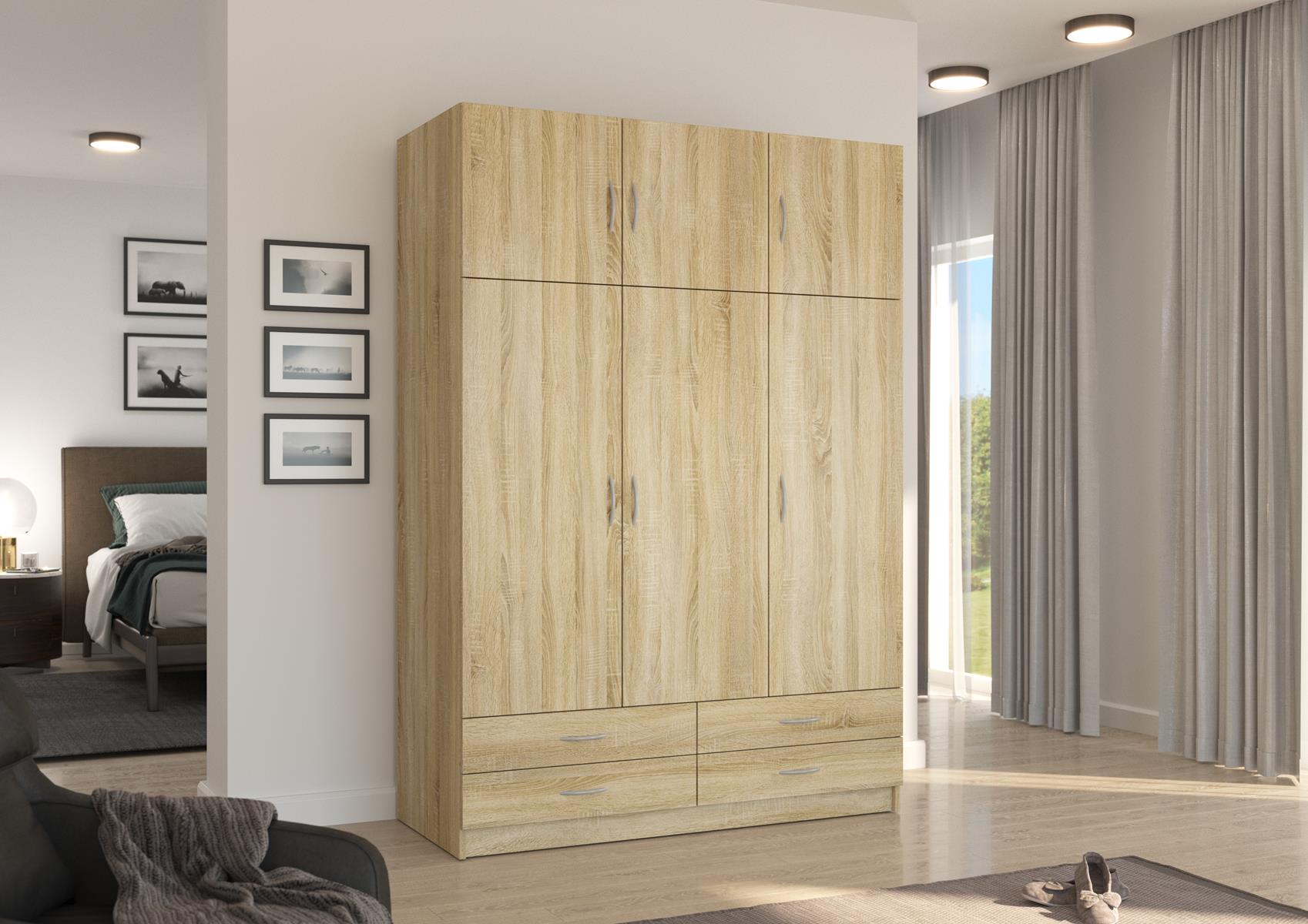 Szafa sześciodrzwiowa z czterema szufladami to funkcjonalny i elegancki mebel do sypialni lub garderoby. Fronty oraz korpus wykonano z płyty laminowanej o grubości 16 mm, a krawędzie zabezpieczono trwałą okleiną z melaminy, co zapewnia odporność na uszkodzenia i estetyczny wygląd.
