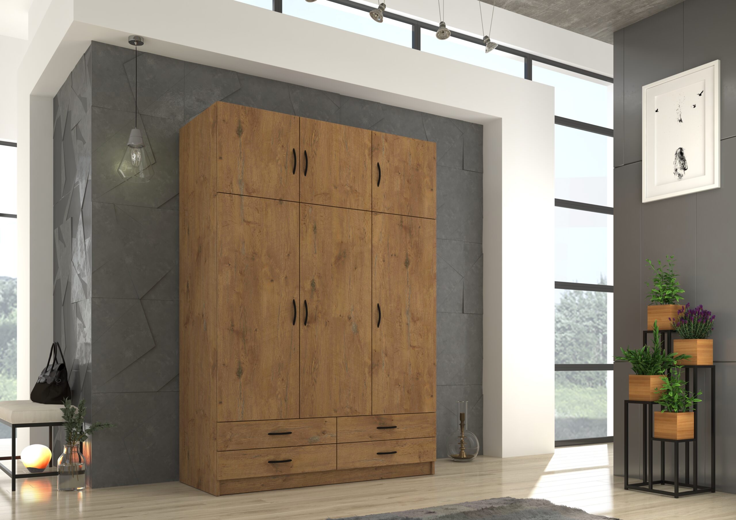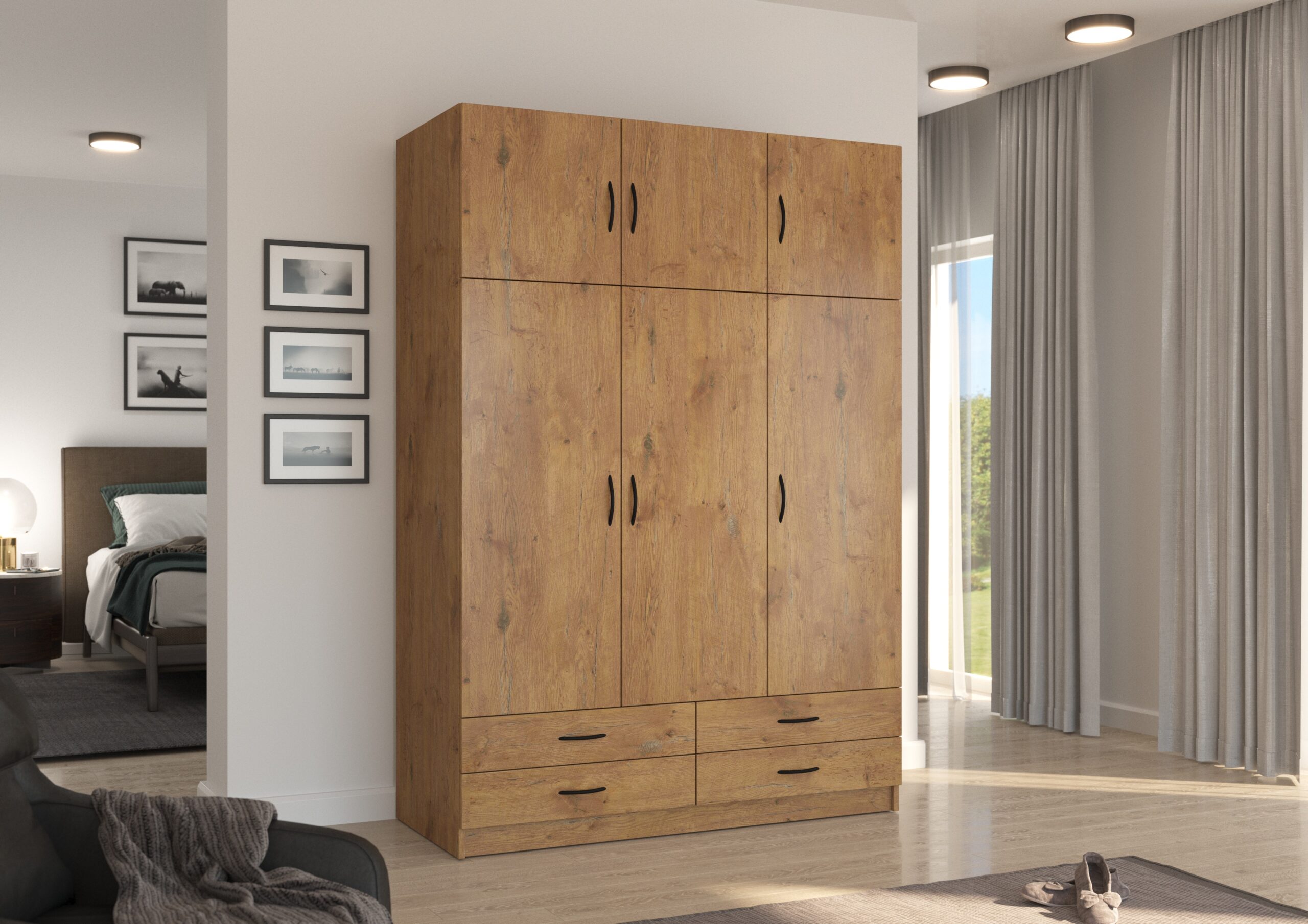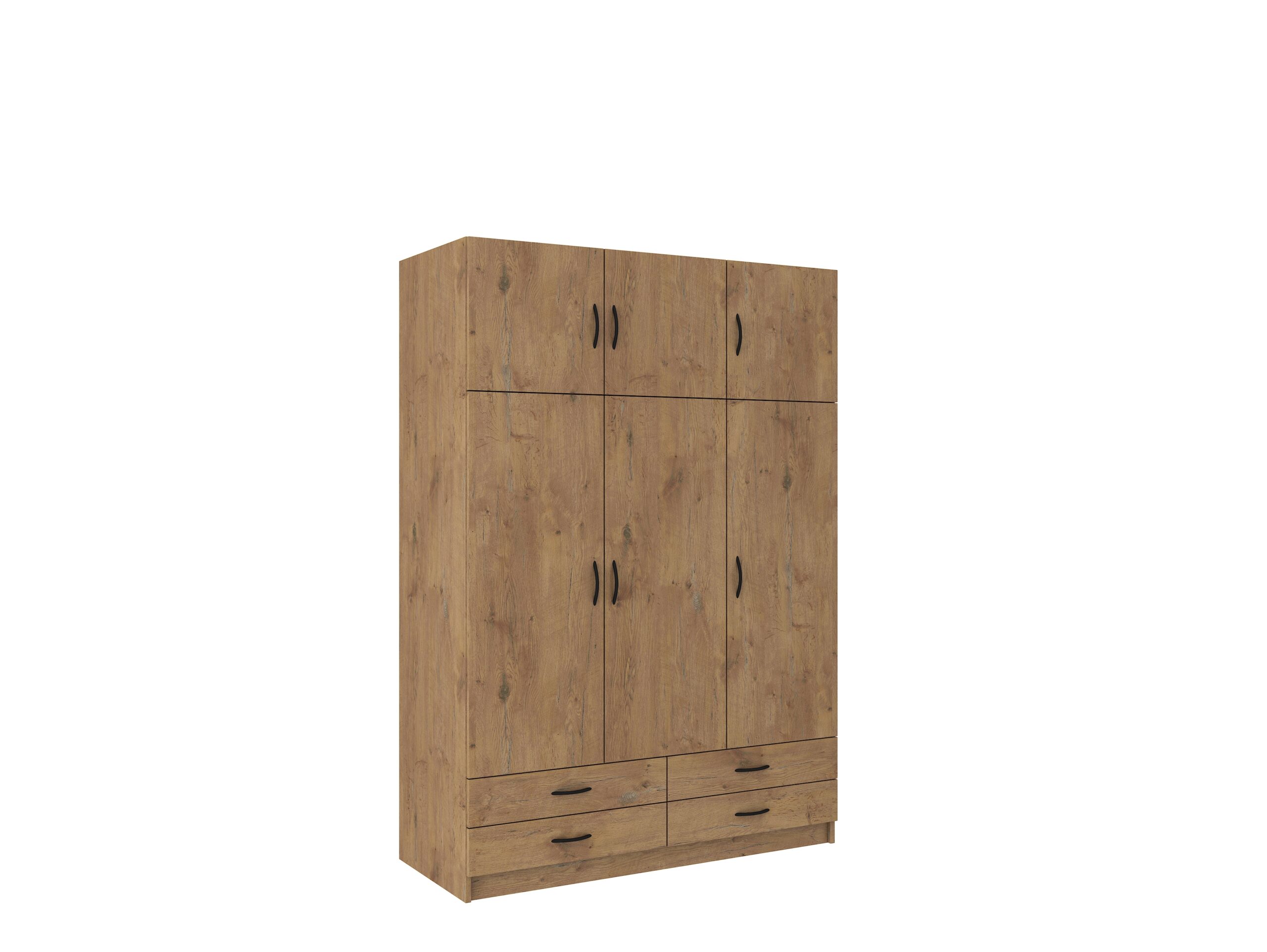 Szafa sześciodrzwiowa z czterema szufladami to funkcjonalny i elegancki mebel do sypialni lub garderoby. Fronty oraz korpus wykonano z płyty laminowanej o grubości 16 mm, a krawędzie zabezpieczono trwałą okleiną z melaminy, co zapewnia odporność na uszkodzenia i estetyczny wygląd.