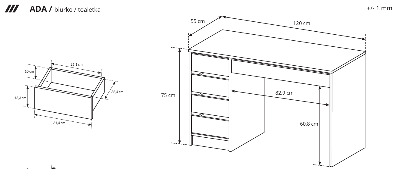 Funkcjonalny zestaw ADA to elegancka i praktyczna toaletka, która doskonale sprawdzi się w sypialni, salonie kosmetycznym lub fryzjerskim. Szuflady pozwalają na wygodne przechowywanie kosmetyków i akcesoriów, utrzymując porządek na blacie.